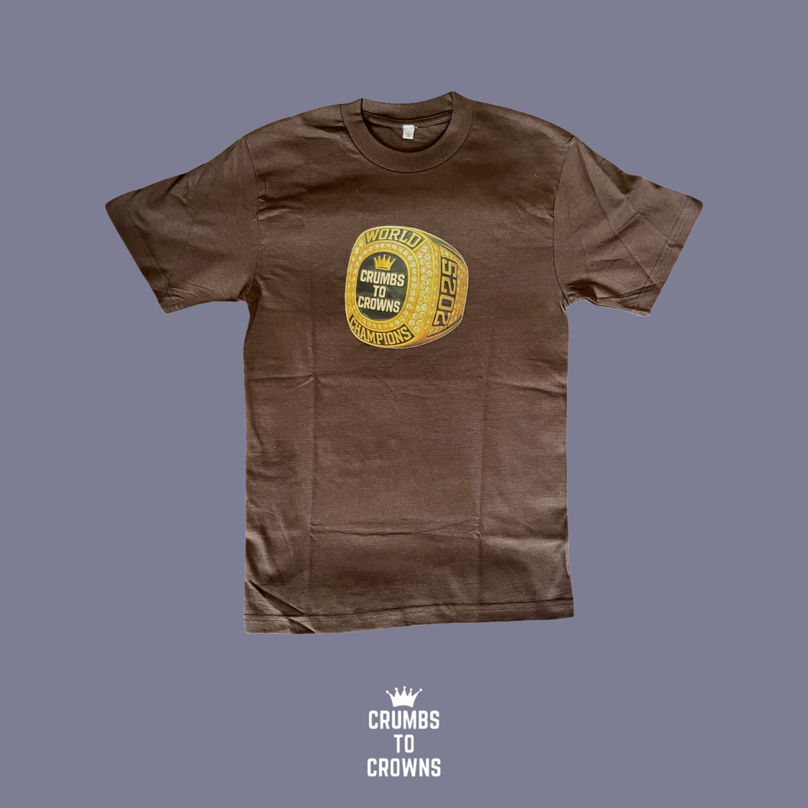The brown "Winning Season" tee showcases a gold "Crumbs to Crowns" championship ring, symbolizing the success of those who excel in their respective fields.