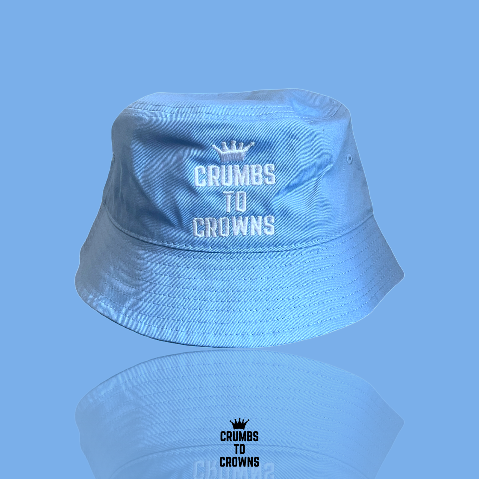 The Classic Logo Bucket Hat in Sky Blue showcases an embroidered Crumbs To Crowns logo in white, making it suitable for both men and women's style.