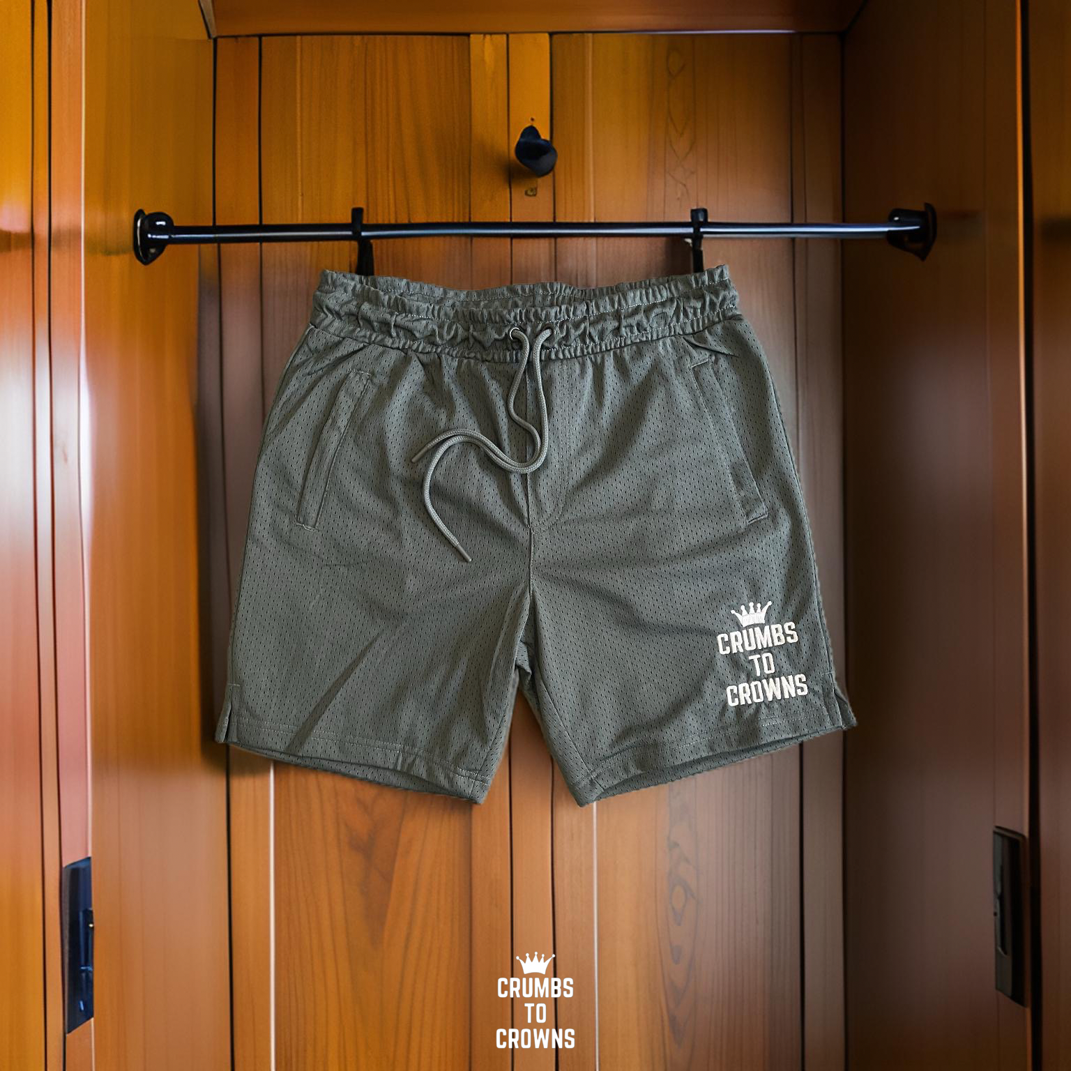 Crafted from a resilient 100% polyester material, our Grey Mesh Shorts boast zippered pockets plus a recognizable Crumbs To Crowns logo. Machine wash cold and iron on a warm temperature when necessary. These shorts are suitable for a variety of different looks and occasions. Unisex.