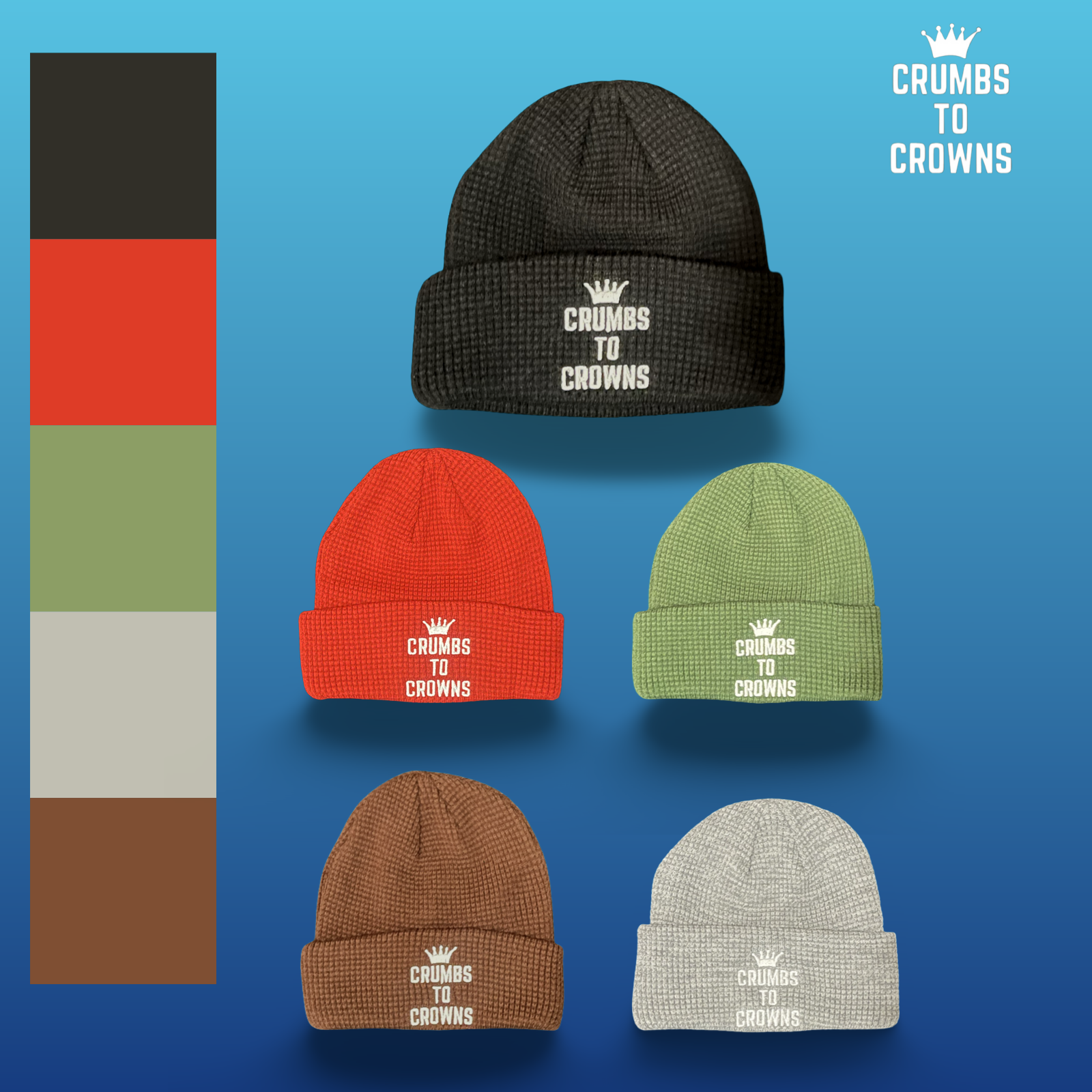 This Crumbs To Crowns Classic Logo Waffle Knit Beanie features a white embroidered Crumbs To Crowns logo along with waffle knitting. Perfect for both men’s and women’s fashion.