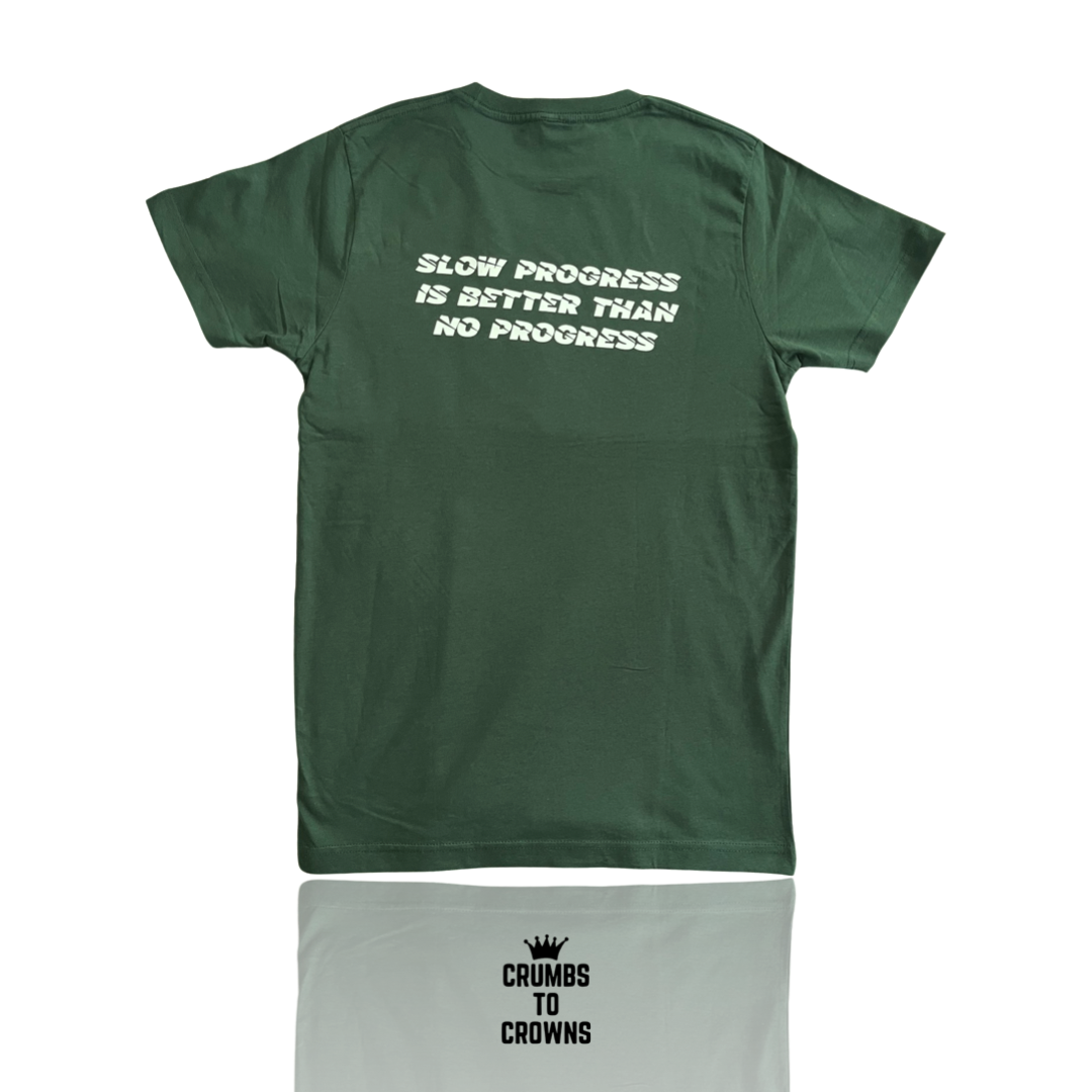 Our “Run Your Race” Tee is designed to illustrate the pride that comes with personal progress. This garment features a contemporary design with the phrase “Crumbs To Crowns” printed on the left chest and “Run Your Race” on the bottom right. Additionally, the back displays the phrase “Slow Progress Is Better Than No Progress”, perfect for daily wear and special occasions.