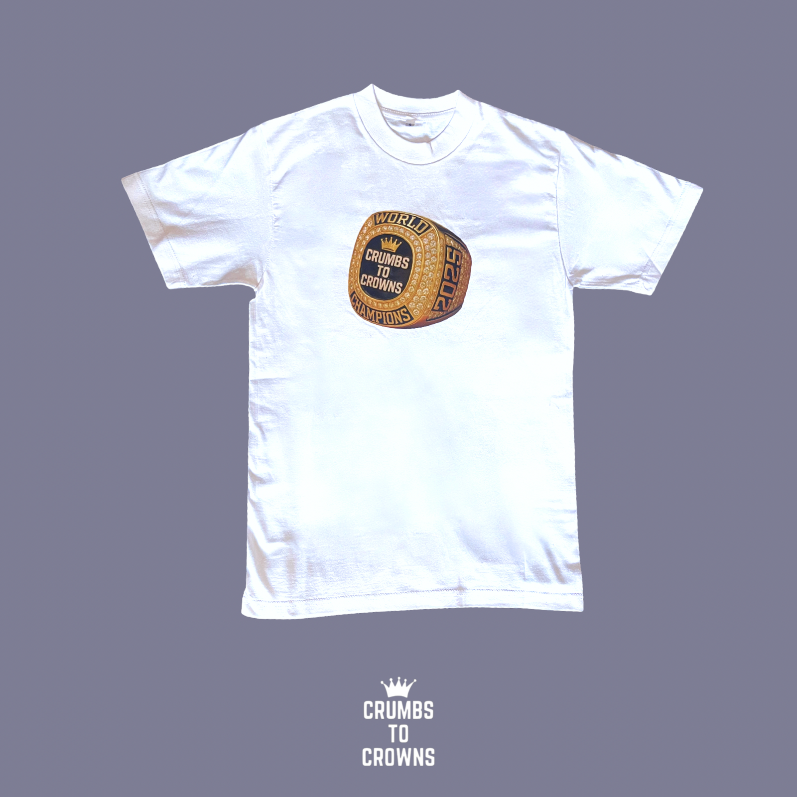 The "Winning Season" tee showcases a gold "Crumbs to Crowns" championship ring, symbolizing the success of those who excel in their respective fields.